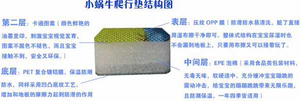 小蝸牛爬行墊無毒無味,防潮隔濕,超大無縫,表面附帶精美的童話圖案,從寶寶學爬到練習走路,再到大點在地上玩耍蹦跳,都是不錯的選擇,是寶寶健康快樂成長的好伴侶。