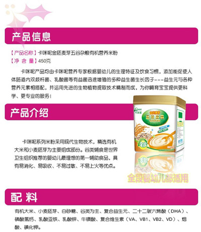 卡咪呢有機米粉系列是專為中國寶寶設(shè)計的營養(yǎng)輔食,選用有機大米,科學(xué)搭配維生素AD等維生素,還特別添加;撬、DHA、AA等有助智力發(fā)育的營養(yǎng)成分,富含15種營養(yǎng)素,F(xiàn)上海卡咪呢母嬰用品有限公司面向全國空白市場區(qū)域誠招卡咪呢有機米粉代理商。