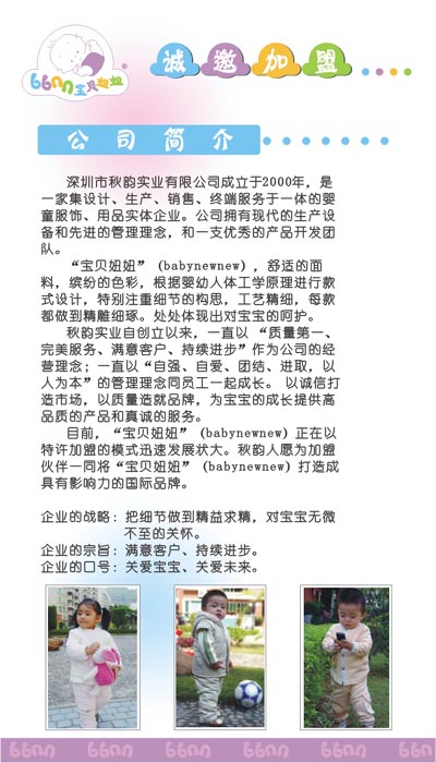 深圳市秋韻實業(yè)有限公司成立于2000年,是一家集設(shè)計、生產(chǎn)、銷售、終端服務(wù)于一體的嬰童服飾、用品實體企業(yè)。公司擁有現(xiàn)代的生產(chǎn)設(shè)備和先進的管理理念,和一支優(yōu)秀的產(chǎn)品開發(fā)團隊。