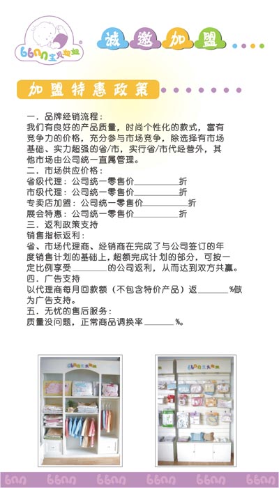 目前,“寶貝妞妞”(babynewnew)正在以特許加盟的模式迅速發(fā)展狀大。秋韻人愿為加盟伙伴一同將“寶貝妞妞”(babynewnew)打造成具有影響力的國際品牌。