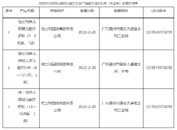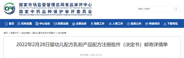 2月28日,國家市場監(jiān)督管理總局食品審評中心發(fā)布嬰幼兒配方乳粉產(chǎn)品配方注冊批件(決定書)郵寄詳情單,共涉及3款嬰配食品,詳情如下: