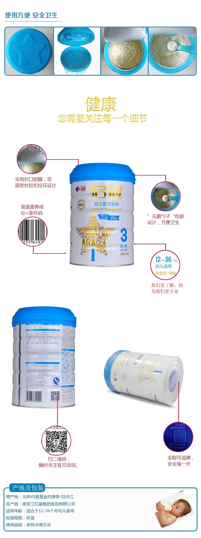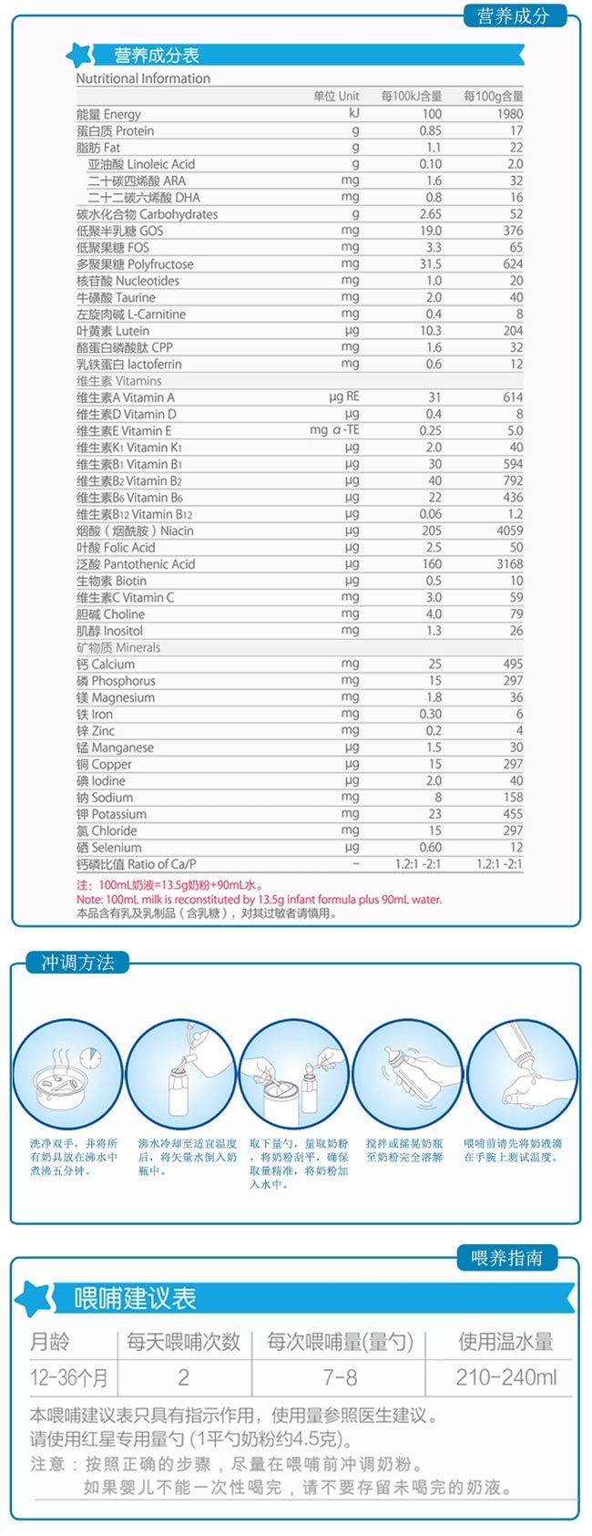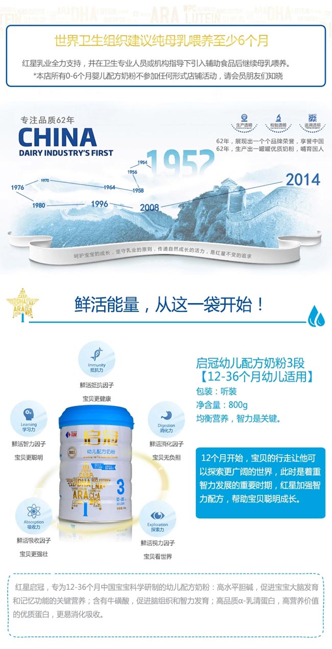 均衡營(yíng)養(yǎng),免疫是關(guān)鍵。 12個(gè)月開(kāi)始,寶貝的行走讓他可以探索更廣闊的世界,此時(shí)是著重智力發(fā)展的重要時(shí)期,紅星加強(qiáng)智力配方,幫助寶貝聰明成長(zhǎng)。 紅星啟冠,專(zhuān)為12-36個(gè)月中國(guó)寶寶科學(xué)研制的幼兒配方奶粉: 高水平膽堿,促進(jìn)寶寶大腦發(fā)育和記憶功能的關(guān)鍵營(yíng)養(yǎng); 含有;撬幔龠M(jìn)腦組織和智力發(fā)育; 高品質(zhì)α-乳清蛋白,高營(yíng)養(yǎng)價(jià)值的優(yōu)質(zhì)蛋白,更易消化吸收。 |