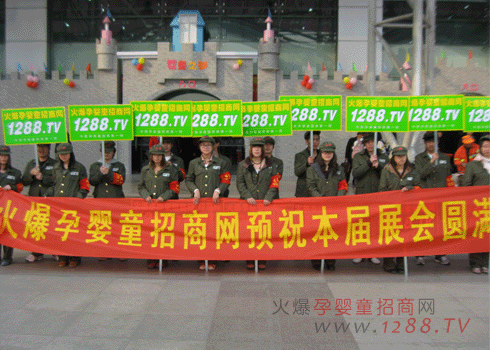 我們火爆孕嬰童穿上我們標(biāo)志性服裝,身穿紅衛(wèi)兵綠色軍裝,頭戴火爆字樣綠色軍帽,左臂佩戴紅色火爆字樣袖章,高舉火爆孕嬰童招商網(wǎng),1288.tv字樣的宣傳牌吸引了所有參展人員的目光。