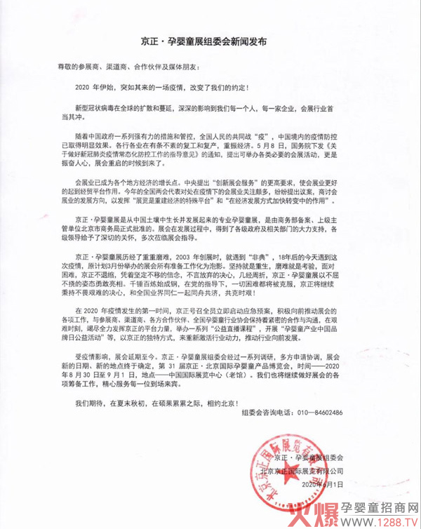 關(guān)于延期舉辦第31屆京正北京國際孕嬰童博覽會京正國際學(xué)前教育及裝備博覽會的通知。